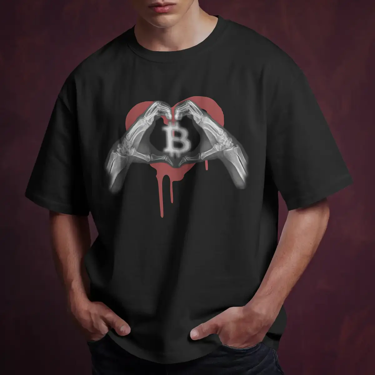 The heart wants what it wants. And what it wants is Bitcoin. The skeletal hands frame the love that outlasts flesh, outlasts FUD, outlasts every cycle that tried to break you. This is devotion that goes to the bone.